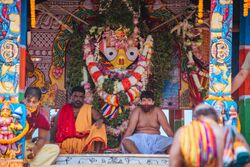 Subhadra is one of the three deities worshipped at the Jagannath temple at Puri, along with Krishna (as Jagannatha) and Balarama (or Balabhadra). The idol of Subhadra is a carved and decorated wooden stump with large round eyes and a symmetric yellow coloured face, contrasting Jagannath's black complexion and Balabhadra'e white complexion. She is decorated with red and black garments and has iconographical elements similar to that of goddess Bhubaneswari which includes a lasso (pasha) and an elephant goad (ankusha). One of the chariots in the annual Ratha Yatra is dedicated to her and is called Dwarpadalana, symbolising destruction of evil.[15] Apart from it she is also believed to be worshipped by certain communities in Odisha, West Bengal, Gujarat and Bangladesh.[16]