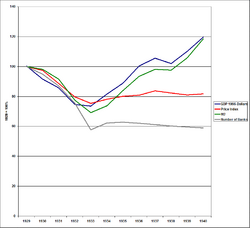 The monetarist explanation was given by American economists Milton Friedman and Anna J. Schwartz.[85] They argued that the Great Depression was caused by the banking crisis that caused one-third of all banks to vanish, a reduction of bank shareholder wealth and more importantly monetary contraction of 35%, which they called "The Great Contraction". This caused a price drop of 33% (deflation).[86] By not lowering interest rates, by not increasing the monetary base and by not injecting liquidity into the banking system to prevent it from crumbling, the Federal Reserve passively watched the transformation of a normal recession into the Great Depression. Friedman and Schwartz argued that the downward turn in the economy, starting with the stock market crash, would merely have been an ordinary recession if the Federal Reserve had taken aggressive action.[87][88] This view was endorsed in 2002 by Federal Reserve Governor Ben Bernanke in a speech honoring Friedman and Schwartz with this statement: