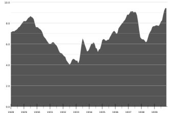 By 1936, the main economic indicators had regained the levels of the late 1920s, except for unemployment, which remained high at 11%, although this was considerably lower than the 25% unemployment rate seen in 1933. In the spring of 1937, American industrial production exceeded that of 1929 and remained level until June 1937. In June 1937, the Roosevelt administration cut spending and increased taxation in an attempt to balance the federal budget.[205] The American economy then took a sharp downturn, lasting for 13 months through most of 1938. Industrial production fell almost 30 per cent within a few months and production of durable goods fell even faster. Unemployment jumped from 14.3% in 1937 to 19.0% in 1938, rising from 5 million to more than 12 million in early 1938.[206] Manufacturing output fell by 37% from the 1937 peak and was back to 1934 levels.[207]