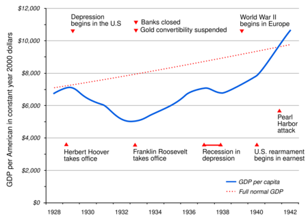 There is no consensus among economists regarding the motive force for the U.S. economic expansion that continued through most of the Roosevelt years (and the 1937 recession that interrupted it). The common view among most economists is that Roosevelt's New Deal policies either caused or accelerated the recovery, although his policies were never aggressive enough to bring the economy completely out of recession. Some economists have also called attention to the positive effects from expectations of reflation and rising nominal interest rates that Roosevelt's words and actions portended.[45][46] It was the rollback of those same reflationary policies that led to the interruption of a recession beginning in late 1937.[47][48] One contributing policy that reversed reflation was the Banking Act of 1935, which effectively raised reserve requirements, causing a monetary contraction that helped to thwart the recovery.[49] GDP returned to its upward trend in 1938.[44] A revisionist view among some economists holds that the New Deal prolonged the Great Depression, as they argue that National Industrial Recovery Act of 1933 and National Labor Relations Act of 1935 restricted competition and established price fixing.[50] John Maynard Keynes did not think that the New Deal under Roosevelt single-handedly ended the Great Depression: "It is, it seems, politically impossible for a capitalistic democracy to organize expenditure on the scale necessary to make the grand experiments which would prove my case—except in war conditions."[51]