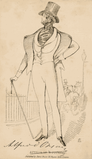 Beau Brummell (George Bryan Brummell, 1778–1840) was the model British dandy since his days as an undergraduate at Oriel College, Oxford, and later as an associate of the Prince Regent (George IV) — all despite not being an aristocrat. Always bathed and shaved, always powdered and perfumed, always groomed and immaculately dressed in a dark-blue coat of plain style.[13] Sartorially, the look of Brummel's tailoring was perfectly fitted, clean, and displayed much linen; an elaborately knotted cravat completed the aesthetics of Brummell's suite of clothes. In the mid–1790s, handsome Beau Brummell was a personable man-about-town who was famous for being famous; a man celebrated "based on nothing at all" but personal charm and social connections.[14][15]