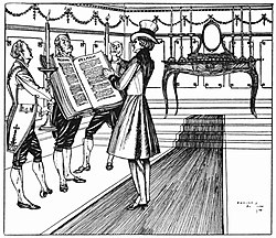 In the late 18th century, the word dandy was an abbreviated usage of the term jack-a-dandy, a 17th-century British usage that described a conceited man.[9] In British North America, before the American Revolution (1765–1791), the British version of the song "Yankee Doodle", specifically the first verse: "Yankee Doodle went to town, / Upon a little pony; / He stuck a feather in his hat, / And called it Macoroni . . ."; and the chorus: "Yankee Doodle, keep it up, / Yankee Doodle Dandy, / Mind the music and the step, / And with the girls be handy. . . ." derided the rustic manner and poverty of colonial Americans, by implying that Macoroni fashion (a fine horse and gold-braided clothing) was what set a dandy apart from colonial society.[10] Moreover, there is an Anglo–Scottish border ballad (c. 1780) that uses the word dandy with a Scots meaning, not the derisive British usage in colonial North America.[11] Since the 18th century, contemporary British usage has distinguished between a dandy and a fop in that the wardrobe of a dandy is more sober and refined than the ostentatious wardrobe of a fop.[12]