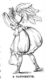 Female dandies did overlap with male dandies for a brief period during the early 19th century when dandy had a derisive definition of "fop" or "over-the-top fellow"; the female equivalents were dandyess or dandizette.[26] Charles Dickens, in All the Year Around (1869) comments, "The dandies and dandizettes of 1819–20 must have been a strange race. "Dandizette" was a term applied to the feminine devotees to dress, and their absurdities were fully equal to those of the dandies."[28] In 1819, Charms of Dandyism, in three volumes, was published by Olivia Moreland, Chief of the Female Dandies; most likely one of many pseudonyms used by Thomas Ashe. Olivia Moreland may have existed, as Ashe did write several novels about living persons. Throughout the novel, dandyism is associated with "living in style". Later, as the word dandy evolved to denote refinement, it became applied solely to men. Popular Culture and Performance in the Victorian City (2003) notes this evolution in the latter 19th century: ". . . or dandizette, although the term was increasingly reserved for men."