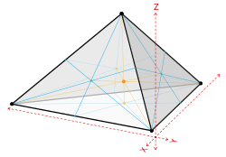 and [math]\displaystyle{ \lambda_4 = 1 - \lambda_1 - \lambda_2 - \lambda_3 }[/math]with the corresponding Cartesian coordinates:[math]\displaystyle{ \begin{align} x &= \lambda_1 x_1 + \lambda_2 x_2 + \lambda_3 x_3 + (1-\lambda_1-\lambda_2-\lambda_3)x_4 \\ y &= \lambda_1 y_1 + \,\lambda_2 y_2 + \lambda_3 y_3 + (1-\lambda_1-\lambda_2-\lambda_3)y_4 \\ z &= \lambda_1 z_1 + \,\lambda_2 z_2 + \lambda_3 z_3 + (1-\lambda_1-\lambda_2-\lambda_3)z_4 \end{align} }[/math]Once again, the problem of finding the barycentric coordinates has been reduced to inverting a 3×3 matrix.