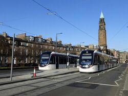 Two Edinburgh Trams seen at the West End - Princes Street stop