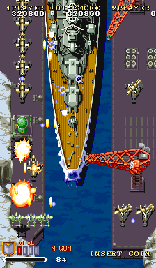 The goal is to shoot down enemy airplanes and collect weapon power-ups (POW).[2] The game uses a vitality system instead of life system in which if the player is hit, it loses one point of vitality and the player is destroyed if hit with 0 vitality then the player is given the option to continue. Lightning attacks can be used by pressing the B button which sacrifices a portion of life energy. Three loops can be performed per level and a bonus is awarded at the end of the level for unused loops. Player 1 uses a P-38 Lightning and Player 2 uses a new plane: DH.98 Mosquito. The game shifts from the original Pacific Front setting with that of the Western Front, in the north Atlantic Ocean.