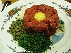 Steak tartare (raw meat) served with raw egg. As close to pure muscle-and-embryo you can get. Yum!