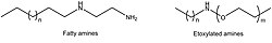 Fatty amines: These corrosion inhibitors are organic compounds that contain an amino group and an alkyl group. They act as cathodic inhibitors and form a protective layer on the metal surface.They work efficiently against corrosion brought about by carbon dioxide (CO2) and hydrogen sulfide (H2S). Also, ethoxylated amines are widely applied for the same purpose (Figure 2).[6]