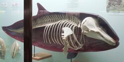 Archaeoceti is a parvorder comprising ancient whales. These ancient whales are the predecessors of modern whales, stretching back to their first ancestor that spent their lives near (rarely in) the water. Likewise, the archaeocetes can be anywhere from near fully terrestrial, to semi-aquatic to fully aquatic, but what defines an archaeocete is the presence of visible legs or asymmetrical teeth.[21][22][23][24] Their features became adapted for living in the marine environment. Major anatomical changes include the hearing set-up that channeled vibrations from the jaw to the earbone which occurred with Ambulocetus 49 million years ago, a streamlining of the body and the growth of flukes on the tail which occurred around 43 million years ago with Protocetus, the migration of the nasal openings toward the top of the cranium and the modification of the forelimbs into flippers which occurred with Basilosaurus 35 million years ago, and the shrinking and eventual disappearance of the hind limbs which took place with the first odontocetes and mysticetes 34 million years ago.[25][26][27] The modern dolphin skeleton has two small, rod-shaped pelvic bones thought to be vestigial hind limbs. In October 2006, an unusual bottlenose dolphin was captured in Japan; it had small fins on each side of its genital slit, which scientists believe to be an unusually pronounced development of these vestigial hind limbs.[28]