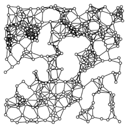 These are graphs consisting of a set of nodes placed according to a point process in some usually bounded subset of the n-dimensional plane, mutually coupled according to a boolean probability mass function of their spatial separation (see e.g. unit disk graphs). The connections between nodes may have different weights to model the difference in channel attenuations.[60] One can then study network observables (such as connectivity,[63] centrality[64] or the degree distribution[65]) from a graph-theoretic perspective. One can further study network protocols and algorithms to improve network throughput and fairness.[60]