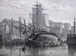 The vessel was then pulled over with tackles from the mastheads to strong-points on the shore. If this was being done on a beach, then the ship's guns might be moved to the shore and used as anchoring points.[4] However a careening wharf in a dockyard was preferred as it would have been equipped with the capstans and rope tackle necessary for hauling over the ship. The ship would have been lightened beforehand by removing all stores and a careening wharf would have had large sheds available to protect them from weather and theft.[4] With one side of the ship raised out of the water, maintenance work would be carried out. Then the ship would be floated off and the process repeated on the other side.[5]