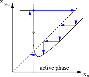 condensed representation of reinjection into the active phase after passage through the silent phase (see Figure 4; see also Medvedev, 2005) .As with differential equation models, coupling may be introduced between map-based bursters, and burst synchronization, featuring various phase relationships, may occur (de Vries, 2005). It has not yet been established, however, what the precise transformations are from forms of coupling studied in differential equation models to coupling terms appearing in maps.