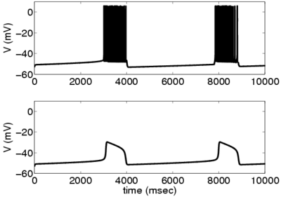 The activity pattern that develops when coupling is introduced between two or more neurons depends on their intrinsic dynamics as well as the nature of the coupling. There are a large variety of possible burst mechanisms that can arise intrinsically in single cell models. These mechanisms can be classified by extracting the fastest evolving equations within a model (the fast subsystem) and considering the bifurcation mechanisms in the dynamics of these equations that yield the onset and offset of the active phase (Rinzel, 1987; Izhikevich, 2000a). For example, the most commonly studied form of bursting is known as square-wave bursting. While the name square-wave bursting refers to the approximately constant spike amplitude seen during the active phase (see Figure 2 below), this solution is also known as fold/homoclinic bursting, since the onset of the active phase occurs at a fold bifurcation for the fast subsystem and the offset of the active phase occurs at a homoclinic bifurcation for the fast subsystem.
