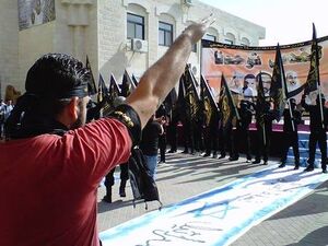 I’ll begin with a simple illustration. The above photograph is of a student rally held last November at Al-Quds University, a mainstream Palestinian institution in East Jerusalem. The rally, in support of the armed fundamentalist group Islamic Jihad, featured actors playing dead Israeli soldiers and a row of masked men whose stiff-armed salute was returned by some of the hundreds of students in attendance. Similar rallies have been held periodically at the school...