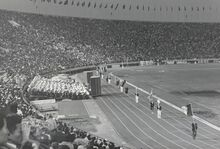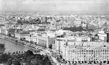 After the war, Tokyo became the base from which the Allied Occupation Forces, under Douglas MacArthur, an American general, administered Japan for six years. The original rebuilding plan of Tokyo was based on a plan modelled after the Metropolitan Green Belt of London, devised in the 1930s but canceled due to the war.[54] However, due to the monetary contraction policy known as the Dodge Line, named after Joseph Dodge, the neoliberal economic advisor to MacArthur, the plan had to be reduced to a minimal one focusing on transport and other infrastructure. In 1947, the 35 pre-war special wards were reorganized into the current 23 wards. Tokyo did not experience fast economic growth until around 1950, when heavy industry output returned to pre-war levels.[29][54] Since around the time the Allied occupation of Japan ended in 1952, Tokyo's focus shifted from rebuilding to developing beyond its pre-war stature. From the 1950s onwards, Tokyo's Metro and railway network saw significant expansion, culminating in the launch of the world's first dedicated high-speed railway line, the Shinkansen, between Tokyo and Osaka in 1964. The same year saw the development of other transport infrastructure, such as the Shuto Expressway to meet the increased demand brought about by the 1964 Tokyo Olympics, the first Olympic Games held in Asia. Around this time, the 31-metre height restriction, imposed on all buildings since 1920, was relaxed due to the increased demand for office buildings and advancements in earthquake-proof construction.[55] Starting with the Kasumigaseki Building (147 metres) in 1968, skyscrapers began to dominate Tokyo's skyline. During this period of rapid rebuilding, Tokyo celebrated its 500th anniversary in 1956[56] and the Ogasawara Islands, which had been under control of the US since the war ended, were returned in 1968.[57] Ryokichi Minobe, a Marxian economist who served as the governor for 12 years starting in 1967, is remembered for his welfare state policy, including free healthcare for the elderly and financial support for households with children, and his 'war against pollution' policy, as well as the large government deficit they caused.[58]