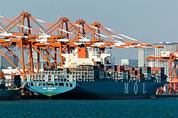 Water transport is the primary means of importing and exporting goods as well as connecting the Tokyo Islands to the mainland. According to Lloyd's List, the Port of Tokyo handled 4,430,000 TEU of containers in 2022, making it the 46th largest port in the world.[192] The Greater Tokyo Area is served by other major ports such as the Port of Yokohama and the Port of Chiba as well. Takeshiba Pier (竹芝埠頭) in Minato is used by Tōkai Kisen, which serves islands such as Izu Ōshima, Miyakejima, Hachijojima, Kozushima,[193] and Ogasawara Kaiun, which serves the Ogasawara Islands.[194] Many of these islands are accessible only by ocean routes and helicopters, as they are too small or undulating for a landing ground, making these ships the primary means of inter-island transport. There are ferry routes that connect landmarks within the mainland portion of Tokyo as well; the Tokyo Cruise Ship and the Tokyo Mizube Line operate several routes between tourist attractions such as Asakusa, Hamarikyu, Odaiba, and Shinagawa Aquarium.[195] The Symphony Cruise operates two large restaurant ships that can also be hired as party venues.[196]