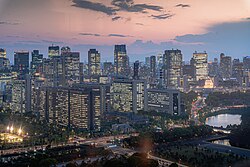 Tokyo's business districts are concentrated in four central wards: Chiyoda (Marunouchi, Otemachi, Kasumigaseki), Chuo (Nihombashi, Kyobashi, Yaesu), Minato (Shimbashi, Shiodome, Toranomon), and Shinjuku (West Shinjuku). The 23 Special Wards of Tokyo had 73.5 million m2 of office space as of January 2022.[156]