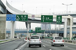 Each road in Tokyo falls into one of the following categories depending on the type of ownership: private roads, municipal roads, metropolitan roads, and expressways. As of April 1, 2022, the total length of roads in Tokyo is approximately 24,741 km (including 2,370 km of metropolitan roads), with a total area of approximately 190.31 km2 (including 46.30 km2 of metropolitan roads).[186] Intercity expressways in and around Tokyo are managed by NEXCO East, while expressways that serve only within the Greater Tokyo Area (Shuto Expressway) are operated by the Metropolitan Expressway Company. Tolls are collected based on the distance travelled. The total length of the Shuto Expressway is 337.8 km, with speed limits usually set at 80 km/h or 60 km/h to reduce noise pollution and accommodate the relatively winding road shapes.[187]