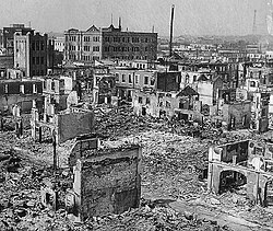 On 1 September 1923, the Great Kanto Earthquake struck the city, and the earthquake and subsequent fire killed an estimated 105,000 citizens. The loss amounted to 37 percent of the country's economic output.[41] On the other hand, the destruction provided an opportunity to reconsider the planning of the city, which had changed its shape hastily after the Meiji Restoration. The high survival rate of concrete buildings promoted the transition from timber and brick architecture to modern, earthquake-proof construction.[42][43] The Tokyo Metro Ginza Line portion between Ueno and Tokyo Metro, Toei, Tobu, the first underground railway line built outside Europe and the American continents, was completed on December 30, 1927.[44] Although Tokyo recovered robustly from the earthquake and new cultural and liberal political movements, such as Taishō Democracy, spread, the 1930s saw an economic downturn caused by the Great Depression and major political turmoil. Two attempted military coups d'état happened in Tokyo, the May 15 incident in 1932 and the February 26 incident in 1936. This turmoil eventually allowed the military wings of the government to take control of the country, leading to Japan joining the Second World War as an Axis power. Due to the country's political isolation on the international stage caused by its military aggression in China and the increasingly unstable geopolitical situations in Europe, Тоkуо had to give up hosting the 1940 Summer Olympics in 1938.[45] Rationing started in June 1940 as the nation braced itself for another world war, while the 26th Centenary of the Enthronement of Emperor Jimmu celebrations took place on a grand scale to boost morale and increase the sense of national identity in the same year. On 7 December 1941, Japan attacked the American bases at Pearl Harbor in Hawaii, entering the Second World War against the Allied Powers. The wartime regime greatly affected life in the city.[46]