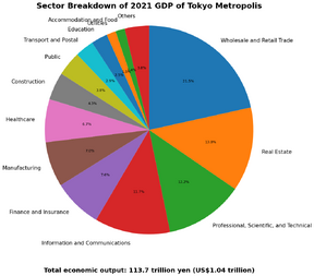 Tokyo's gross regional product was 113.7 trillion yen or US$1.04 trillion in FY2021 and accounted for 20.7% of the country's total economic output, which converts to 8.07 million yen or US$73,820 per capita.[8] By sector, Wholesale and Retail was the largest contributor, accounting for 21.5% of the total output. This was followed by Real Estate (13.5%), Professional, Scientific and Technical (12.2%), Information and Communications (11.7%), Finance and Insurance (7.6%), Manufacturing (7.0%), and Healthcare (6.7%). Agriculture, Forestry and Fishery, and Mining combined accounted for less than 0.1% of the economic output.[154] As these numbers suggest, Tokyo's economy is heavily dependent on the tertiary sector. As the Greater Tokyo Area, it has the second-largest metropolitan economy in the world, after Greater New York, with a gross metropolitan product estimated at US$2 trillion. The area's economy is slightly smaller than Canada's economy while being slightly larger than Mexico's, according to IMF estimates from the same year.[155]