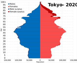 In 2021, Tokyo's average and median ages were both 45.5 years old. This is below the national median age of 49.0, placing Tokyo among the youngest regions in Japan. 16.8% of the population was below 15, while 34.6% was above 65.[142] In the same year, the youngest municipalities in Tokyo were Mikura-jima (average age 40.72), Chuo (41.92), and Chiyoda (42.07), while the oldest included Okutama (59.11) and Miyake (53.82).[143]
