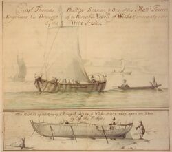 The construction and sailing of a seagoing curach of the 17th century – a hybrid of the skin-covered and plank-built boat – was depicted in some detail by an Englishman, Captain Thomas Phillips: "A portable vessel of wicker ordinarily used by the Wild Irish".[11]