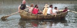The currach bears a close resemblance to the coracle, a similar circular rowboat used in Wales, and to the wide family of circular boats termed "coracles" common throughout South and Southeast Asia. These non-Irish coracles all ultimately trace their origin to the quffa, a round Iraqi riverboat dating to the 9th century BCE, or possibly even as early as the 2nd millennium BCE.[9] The resemblances between the currach and the coracle and quffa are a coincidence, however. British ethnologist James Hornell, who studied the currach, coracle, and quffa extensively during the early 20th century, believes that the currach was developed independently of the coracle and quffa in a case of multiple invention.[10]