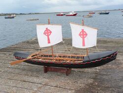 One of these is the Latin account of the voyage of St Brendan (who was born c. 484 in the southwest of Ireland): Navigatio sancti Brendani abbatis. This contains an account of the building of an ocean-going boat: using iron tools, the monks made a thin-sided and wooden-ribbed vessel sicut mos est in illis partibus ("as the custom is in those parts"), covering it with hides cured with oak bark. Tar was used to seal the places where the skins joined. A mast was then erected in the middle of the vessel and a sail supplied.[5] Though the voyage itself is essentially a wonder-tale, it is implied that the vessel as described was built in accordance with ordinary practice at the time. An Irish martyrology of the same period says of the Isle of Aran that the boat commonly used there was made of wickerwork and covered with cowhide.[6]