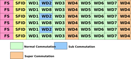 A set of data words, together with synchronization and ID or counter words, constitute a minor frame; a set number of minor frames are combined to form a major frame. Measurands occupy fixed positions within each major frame, with these positions defined in a database, allowing them to be extracted. Measurands may be sampled multiple times within each minor frame (supercommutation), or they may only be sampled once in several frames (subcommutation), depending on the required data rate for each measurand.[1]