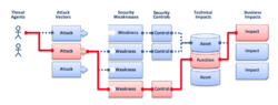 OWASP (see figure) depicts the same phenomenon in slightly different terms: a threat agent through an attack vector exploits a weakness (vulnerability) of the system and the related security controls causing a technical impact on an IT resource (asset) connected to a business impact.