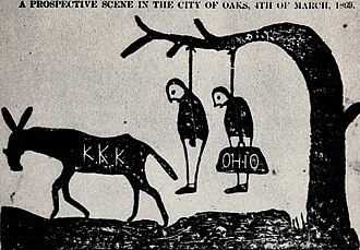 The revived Klan differed from the original in other ways as well. The old Klan was genuinely clandestine; the revived Klan was a public entity pandering parading in the streets, one that bigots could join by mail order.[9] The old Klan was Southern and Democratic; the revived Klan was Midwestern and Republican, and managed to politically dominate several states, most notably Indiana in the early 1920s. In fact, the Klan became so mainstream they openly sponsored festivals, weddings, baby christenings, political rallies, and even baseball teams.[9] They even managed to organize a nationwide boycott against Jewish, black, and immigrant shopowners.[10] This is also the Klan iteration which created the KKK symbol of the burning cross;[11] the first Klan had never used it.