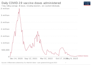 Vaccinations in the U.S. military[edit | edit source]On August 9, 2021, all servicemembers received a memo explaining that, under a plan endorsed by President Biden and by military leadership, COVID-19 vaccination would become mandatory within about a month.[173] About a third of active U.S. military service members had already been vaccinated as of late April;[174] and about two-thirds (73% of all service members) had already been vaccinated by the time the memo was sent.[175] The U.S. Navy had been the fastest to begin vaccination in early 2021. As of April 22, 2021, considering active military personnel who had received at least one dose, the U.S. Navy had the highest percentage at 51%, the Marines at 36%, the Air Force/Space Force at 34%, and the Army at 27%.[174] By late May 2021, at least 58% of active military personnel had received at least one dose of the COVID-19 vaccine.[176] As of April 9, 2021, 39% of U.S. Marines to whom the military offered the vaccine had refused it. The highest rate of refusal was at Camp Lejeune in North Carolina, where 57% of Marines had refused the vaccine.[177] On August 23, 2021, the Pfizer-BioTech vaccine got its full FDA approval, prompting vaccinations to be required for all active duty, reserve, and National Guard troops starting August 25.[178] By the time the vaccination requirement order was sent out, only 68% of active-duty troops were fully vaccinated.[179] On September 1, 2021, the U.S. Navy mandated vaccination of all active-duty Navy sailors and U.S. Marines by November 28 and of reservists by December 28.[180] On September 3, 2021, the U.S. Air Force mandated vaccination of all active-duty airmen and U.S. Space Force Guardians by November 2, while Air Force reservists had until December 2.[181] On September 14, 2021, the U.S. Army mandated vaccination of all active duty soldiers by December 15 and of reservists by June 30, 2022.[182] Vaccine certificates[edit | edit source]The U.S. does not issue a federally mandated COVID-19 certificate nor a digital proof that would allow venues to check the vaccine status of participants consistently. CDC vaccine cards that contain personal information including patient numbers and place of vaccinations are accepted in those European countries where American military personnel are stationed. However, those cards are not immediately transferrable to EU Digital COVID Certificates since CDC cards are not digitally validated and do not contain a counterfeit-proof or unique identifier. Asian countries have similar health certificate requirements for entering their territories. The lack of a federal system for checking COVID-19 status has put the United States in a disadvantage compared to nations in Europe and Asia.[183] Public opinion[edit | edit source]The Kaiser Family Foundation conducts ongoing polling and analysis in a project called the KFF COVID-19 Vaccine Monitor.[184] It considers demographics including age, race, political party, education, and insurance status when examining vaccine hesitancy.[185] A KFF study in December 2020 showed that 27% of the general public, and 29% of health careworkers, were hesitant to be vaccinated.[186][184] In December 2020 a Gallup poll found that 63% of Americans were willing to receive the COVID-19 vaccine.[184] Safety concerns about the currently available vaccines are a primary factor in vaccine hesitancy and refusal. Most unvaccinated adults are not confident in the safety of the available vaccines and while 63% of parents are confident the vaccines are safe for adults only about half of those who are confident in safety for adults are confident they are safe for ages 12–17 and it is further reduced for even younger age groups. The need for more research for the vaccines is the most stated reason given by parents for not wanting to have their child vaccinated.[187] Political leanings are reflected in vaccine hesitancy. Early in the pandemic, before vaccines were available, a poll conducted May 20–21, 2020, found that 44% of Republicans and 19% of Democrats believed a debunked conspiracy theory that Bill Gates was plotting to use a COVID-19 vaccine to inject microchips into the population.[188] Months after vaccination began, a Monmouth poll conducted April 8–12, 2021, found that two-thirds of Democratic voters had already been vaccinated but only one-third of Republican voters had done so.[189] A Quinnipiac poll conducted on the same dates found that 45% of Republicans said they did not plan to be vaccinated.[190] The New York Times wrote that the vaccination program was "hitting what appears to be a soft ceiling" as it moved to dealing with the demographic groups where vaccine hesitancy was stronger.[191] In January 2021, approximately one third of the population was concerned the vaccine might be made mandatory.[192] A Frank Luntz poll in mid-April 2021 found a rise in vaccine confidence from the previous month, despite the pause of the Johnson and Johnson vaccine.[193] A later poll by The Washington Post and ABC News found that 86% of self-identified Democrats surveyed had received at least one dose, as opposed to 45% of self-identified Republicans.[138][137] In July 2021, The New York Times noted that there were two groups of Americans who remained hesitant to get the vaccine, the first group being "a mix of people but tend to be disproportionately white, rural, evangelical Christian and politically conservative" and the second group being "a broad range of people, but tend to be a more diverse and urban group, including many younger people, Black and Latino Americans, and Democrats."[194] At the end of November 2022, "only about 13% of those eligible ha[d] received an updated booster dose."[195] See also[edit | edit source]