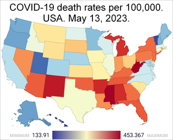 United States. Percentage with at least one vaccination dose. See Commons source for date of last upload. US territories: GU = Guam. AS = American Samoa. MP = Northern Mariana Islands. VI = Virgin Islands. Associated states: PW = Republic of Palau. FM = Federated States of Micronesia. MH = Marshall Islands.[1] | |