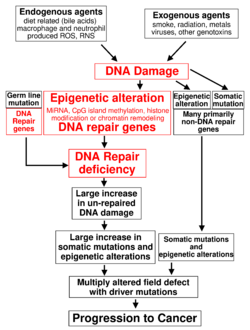 During repair of DNA double strand breaks, or repair of other DNA damages, incompletely cleared sites of repair can cause epigenetic gene silencing.[38][39] DNA repair deficiencies (level 4 in the figure) cause increased DNA damages (level 5 in the figure) which result in increased somatic mutations and epigenetic alterations (level 6 in the figure).