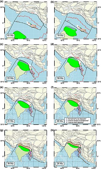 The Greater India Basin hypothesis suggests that there was a two-stage collision between India and Asia continent.[9] The first stage occurred at approximately 50 Ma, where a microcontinent from the Indian plate collided with the Asian continent.[9] It was followed by the subduction of the oceanic Great India Basin, which was located in between the microcontinent and the major Indian craton, under the Asian continent.[9] The second stage of collision occurred after the oceanic crust of the Great India Basin had been consumed, where the major Indian craton finally came into contact and collided with the Asian continental margin (including the previously "merged" microcontinent, which was interpreted to be the modern Tibetan Plateau) at 25–20 Ma.[9]
