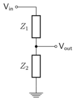 A voltage divider referenced to ground is created by connecting two electrical impedances in series, as shown in Figure 1. The input voltage is applied across the series impedances Z1 and Z2 and the output is the voltage across Z2. Z1 and Z2 may be composed of any combination of elements such as resistors, inductors and capacitors.