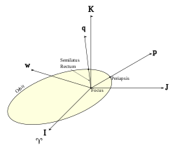 The perifocal coordinate (PQW) system is a frame of reference for an orbit. The frame is centered at the focus of the orbit, i.e. the celestial body about which the orbit is centered. The unit vectors [math]\displaystyle{ \mathbf{\hat{p}} }[/math] and [math]\displaystyle{ \mathbf{\hat{q}} }[/math] lie in the plane of the orbit. [math]\displaystyle{ \mathbf{\hat{p}} }[/math] is directed towards the periapsis of the orbit and [math]\displaystyle{ \mathbf{\hat{q}} }[/math] has a true anomaly ([math]\displaystyle{ \theta }[/math]) of 90 degrees past the periapsis. The third unit vector [math]\displaystyle{ \mathbf{\hat{w}} }[/math] is the angular momentum vector and is directed orthogonal to the orbital plane such that:[1][2] [math]\displaystyle{ \mathbf{\hat{w}} = \mathbf{\hat{p}} \times \mathbf{\hat{q}} }[/math]