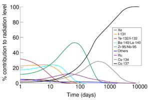 According to Jiri Hala's textbook,[14] the radioactivity in the fission product mixture in an atom bomb is mostly caused by short-lived isotopes such as iodine-131 and barium-140. After about four months, cerium-141, zirconium-95/niobium-95, and strontium-89 represent the largest share of radioactive material. After two to three years, cerium-144/praseodymium-144, ruthenium-106/rhodium-106, and promethium-147 are responsible for the bulk of the radioactivity. After a few years, the radiation is dominated by strontium-90 and caesium-137, whereas in the period between 10,000 and a million years it is technetium-99 that dominates.