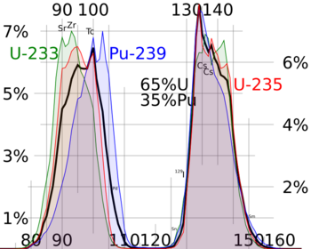 In general the higher the energy of the state that undergoes nuclear fission, the more likely that the two fission products have similar mass. Hence, as the neutron energy increases and/or the energy of the fissile atom increases, the valley between the two peaks becomes more shallow.[4] For instance, the curve of yield against mass for 239Pu has a more shallow valley than that observed for 235U when the neutrons are thermal neutrons. The curves for the fission of the later actinides tend to make even more shallow valleys. In extreme cases such as 259Fm, only one peak is seen; this is a consequence of symmetric fission becoming dominant due to shell effects.[5]