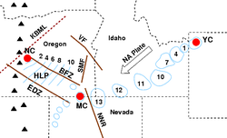 Yellowstone sits on a hotspot, which is an area that has volcanism outside of a plate boundary. As the North American Plate moves over the asthenosphere, the hotspot remains in place, so the eruptions from the hotspot can track the plate motion[14] — and there are old calderas that were left by the hotspot that can be found as far away as Nevada.[15] Due to plate motion, the caldera is moving away from the hotspot, and as a result if Yellowstone does erupt again during our lifetime, it would almost certainly be a small-scale lava flow rather than a cataclysmic event.[16]