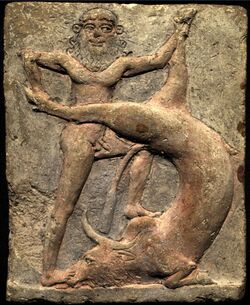 Anu gives Ishtar the Bull of Heaven, and Ishtar sends it to attack Gilgamesh and his friend Enkidu.[310][314] Gilgamesh and Enkidu kill the Bull and offer its heart to the sun-god Shamash.[315][314] While Gilgamesh and Enkidu are resting, Ishtar stands up on the walls of Uruk and curses Gilgamesh.[315][316] Enkidu tears off the Bull's right thigh and throws it in Ishtar's face,[315][316] saying, "If I could lay my hands on you, it is this I should do to you, and lash your entrails to your side."[317] (Enkidu later dies for this impiety.)[316] Ishtar calls together "the crimped courtesans, prostitutes and harlots"[315] and orders them to mourn for the Bull of Heaven.[315][316] Meanwhile, Gilgamesh holds a celebration over the Bull of Heaven's defeat.[318][316]