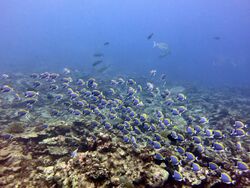 When herbivores are affected by trophic cascades, plant communities can be indirectly affected.[66] Often these effects are felt when predator populations decline and herbivore populations are no longer limited, which leads to intense herbivore foraging which can suppress plant communities.[67] With the size of herbivores having an effect on the amount of energy intake that is needed, larger herbivores need to forage on higher quality or more plants to gain the optimal amount of nutrients and energy compared to smaller herbivores.[68] Environmental degradation from white-tailed deer (Odocoileus virginianus) in the US alone has the potential to both change vegetative communities[69] through over-browsing and cost forest restoration projects upwards of $750 million annually. Another example of a trophic cascade involved plant-herbivore interactions are coral reef ecosystems. Herbivorous fish and marine animals are important algae and seaweed grazers, and in the absence of plant-eating fish, corals are outcompeted and seaweeds deprive corals of sunlight.[70]