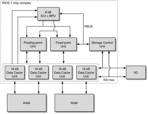 The POWER1 is a multi-chip CPU built from separate chips that are connected to each other by buses. The POWER1 consists of an instruction-cache unit (ICU), a fixed-point unit (FXU), a floating point unit (FPU), a number of data-cache units (DCU), a storage-control unit (SCU) and an I/O unit. Due to its modular design, IBM was able to create two configurations by simply varying the number of DCUs, RIOS-1 and a RIOS.9. The RIOS-1 configuration has four DCUs, the intended amount, and was clocked at up to 40 MHz, whereas the RIOS.9 CPU had two DCUs and was clocked at lower frequencies.