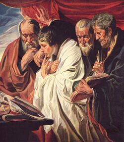 The word evangelist comes from the Koine Greek word εὐανγέλιον (transliterated as euangelion) via Latinised evangelium as used in the canonical titles of the Four Gospels, authored by (or attributed to) Matthew, Mark, Luke, and John (also known as the Four Evangelists). The Greek word εὐαγγέλιον originally meant a reward given to the messenger for good news (εὔ = "good", ἀνγέλλω = "I bring a message"; the word "angel" comes from the same root) and later "good news" itself.