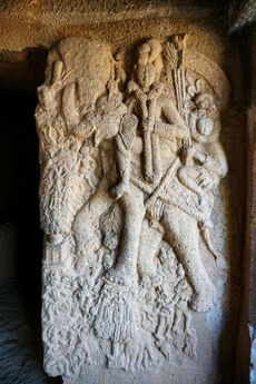 Indra on his elephant, guarding the entrance of the 1st century BCE Buddhist Cave 19 at Bhaja Caves (Maharashtra).[29]