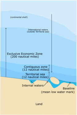 The boundaries of a nation's territorial sea were initially proposed to be three miles in the late 18th century.[182] The UNCLOS instead defined it as being at most 12 nautical miles from the baseline (usually the coastal low-water mark) of a state; both military and civilian foreign ships are allowed innocent passage through these waters despite the sea being within the state's sovereignty.[183][184] A state can have jurisdiction beyond its territorial waters where it claims a contiguous zone of up to 24 nautical miles from its baseline for the purpose of preventing the infringement of its "customs, fiscal, immigration and sanitary regulations".[185] States are also able to claim an exclusive economic zone (EEZ) following passage of the UNCLOS, which can stretch up to 200 nautical miles from the baseline and gives the sovereign state rights over natural resources. Some states have instead chosen to retain their exclusive fishery zones, which cover the same territory.[186] There are specific rules in relation to the continental shelf, as this can extend further than 200 nautical miles. The International Tribunal for the Law of the Sea has specified that a state has sovereign rights over the resources of the entire continental shelf, regardless of its distance from the baseline, but different rights apply to the continental shelf and the water column above it where it is further than 200 nautical miles from the coast.[187]