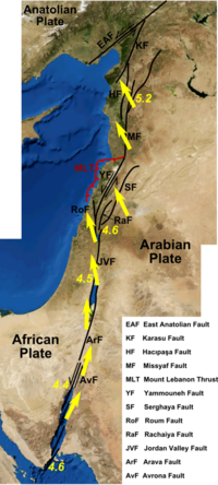 - ↑ Klinger Y.; Avouac J.P.; Karaki N.A.; Dorbath L.; Bourles D.; Reyss J.L. (2000). "Slip rate on the Dead Sea transform fault in northern Araba valley (Jordan)". Geophysical Journal International 142 (3): 755–768. doi:10.1046/j.1365-246x.2000.00165.x. Bibcode: 2000GeoJI.142..755K. http://www.pellamuseum.org/Pella_Museum/Dead_Sea/seismic_beh.pdf.