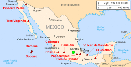 Major active volcanoes of Mexico. From west to east, volcanoes part of the Trans-Mexican Volcanic belt are Nevado de Colima, Parícutin, Popocatépetl, and Pico de Orizaba.