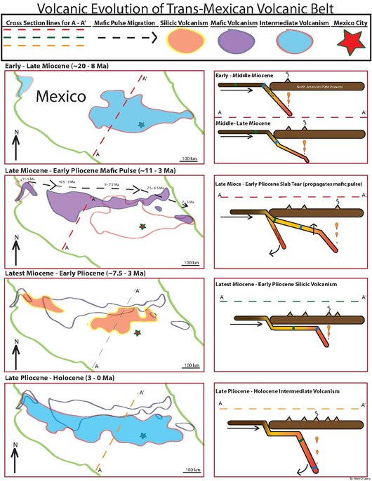 - ↑ 5.0 5.1 5.2 5.3 5.4 5.5 Ferrari, Luca. "The Geochemical Puzzle of the Trans-Mexican Volcanic Belt: Mantle Plume, Continental Rifting, or Mantle Perturbation Induced by Subduction?". http://www.mantleplumes.org/Mexico2.html.
