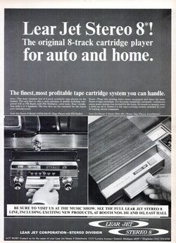 The Stereo 8 Cartridge was created in 1964 by a consortium led by Bill Lear, of Lear Jet Corporation,[8] along with Ampex, Ford Motor Company, General Motors, Motorola, and RCA Victor Records (RCA - Radio Corporation of America).